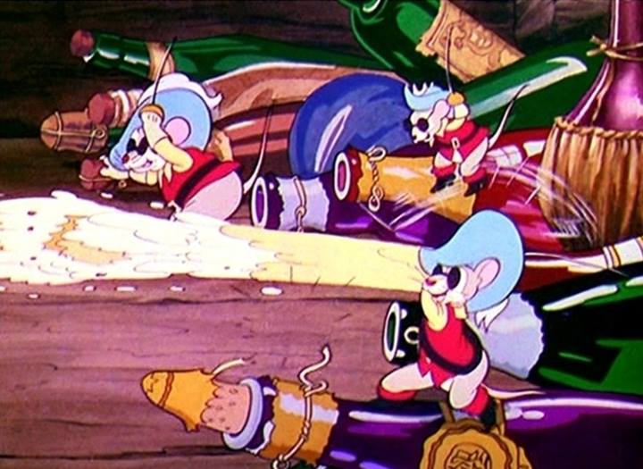 Est-ce la première fois qu’on se servait ainsi des bouteilles de champagne dans un film, c’est difficile à dire, mais ce que l’on sait en revanche c’est que ce gag fut développé quelques années plus tôt, en 1936, dans un court-métrage d’animation, une des Silly Symphonies produites par Walt Disney, Three Blind Mouseketeers (Trois espiègles petites souris), où, dans cette parodie animalière des trois mousquetaires, les souris se servent des bouteilles de champagne comme des pièces d’artillerie. On retrouvera quasiment le même gag dans une autre animation datant de 1948 The Little Orphan (Le Petit Orphelin), un Tom et Jerry réalisé par William Hanna et Joseph Barbera et qui remportera l’Oscar du meilleur court métrage d’animation.