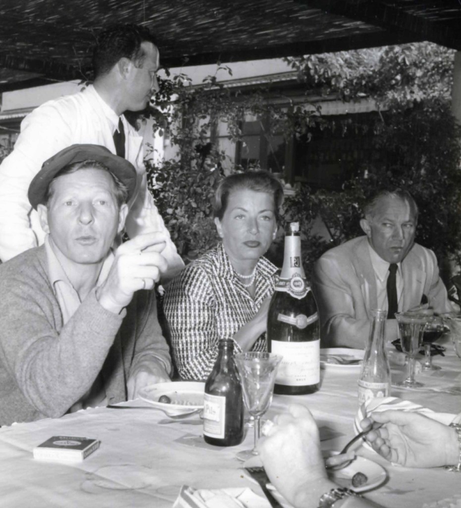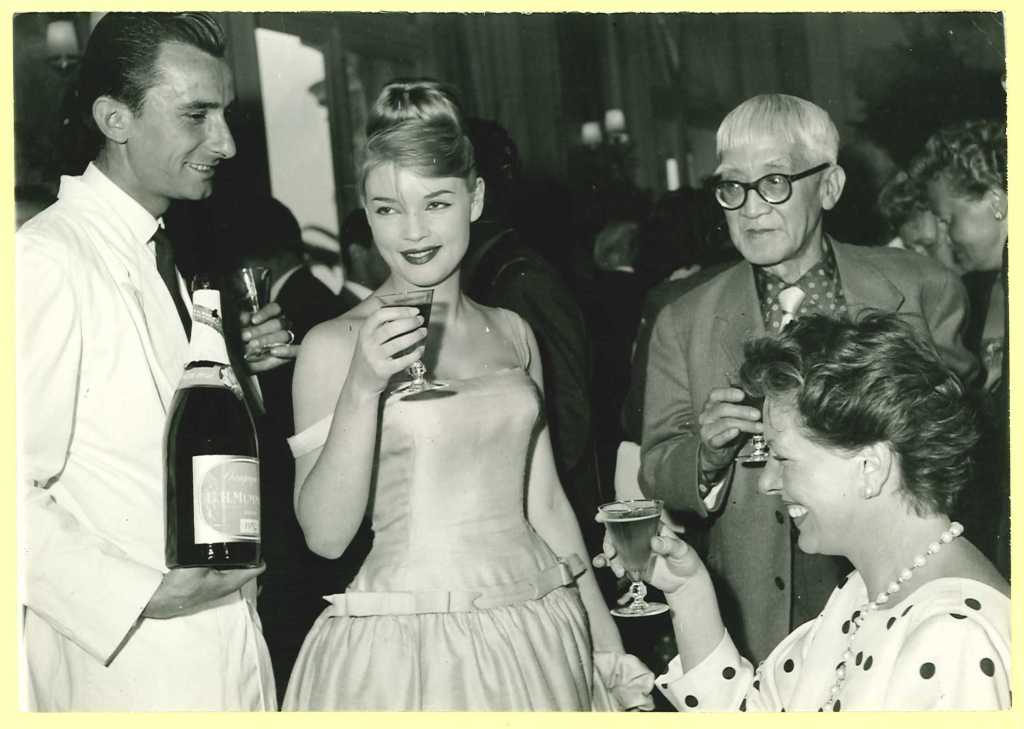 A droite : René Lalou (Président du conseil d’administration de G.H.Mumm), Jean Marais, Agnès Laurent, Madeleine Robinson, Foujita
