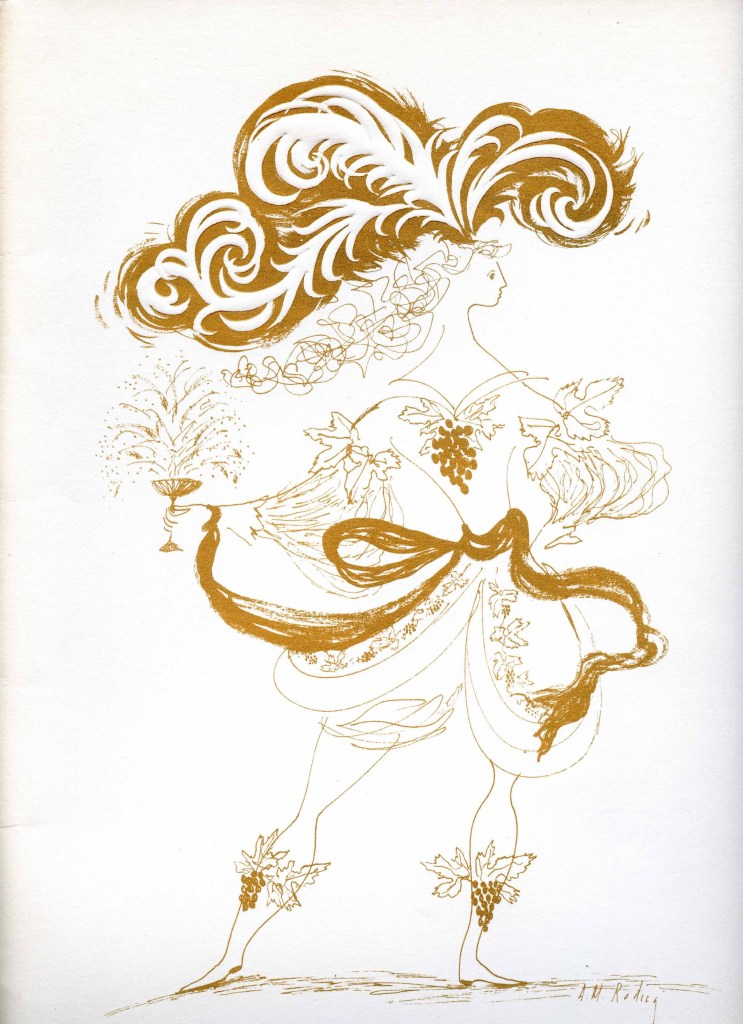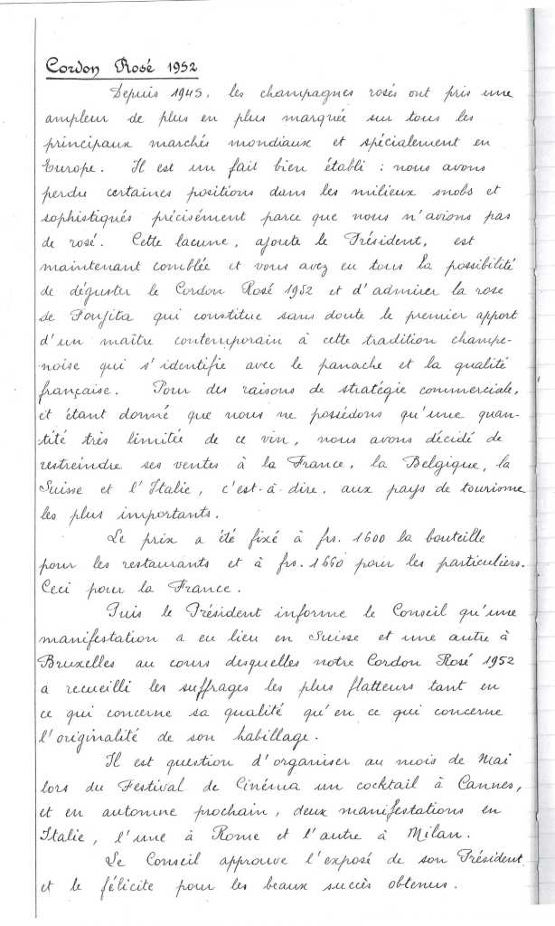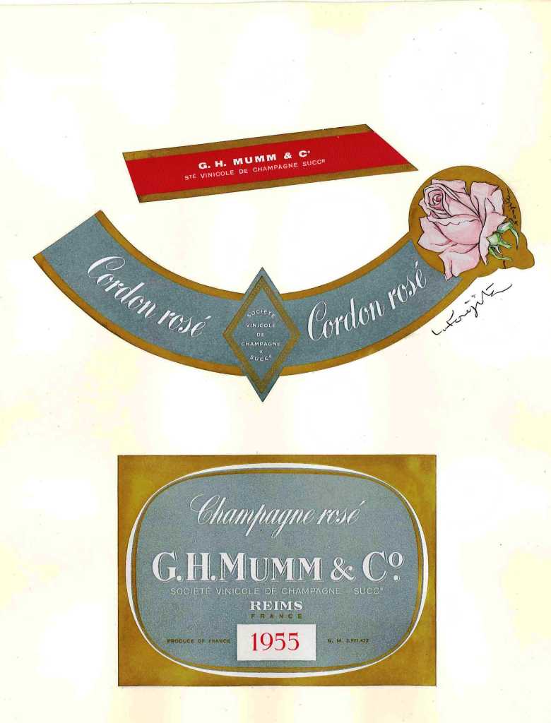 Lors du festival de 1958, la maison G.H. Mumm lança une nouvelle cuvée, un « Cordon Rosé ». Sur l’habillage de la bouteille, on pouvait voir le dessin d’une rose qui fut commandé par René Lalou (le président du conseil d’administration de G.H. Mumm) au peintre Léonard Foujita (qui devait par la suite décorer la chapelle Notre-Dame-de-la-Paix, construite en 1966 sur un terrain appartenant à Mumm). A l’époque, le Cordon Rosé était un champagne millésimé assez rare, plutôt cher, produit en assez petite quantité et qui ne fut lancé qu’en France, Belgique, Suisse et… Italie.
